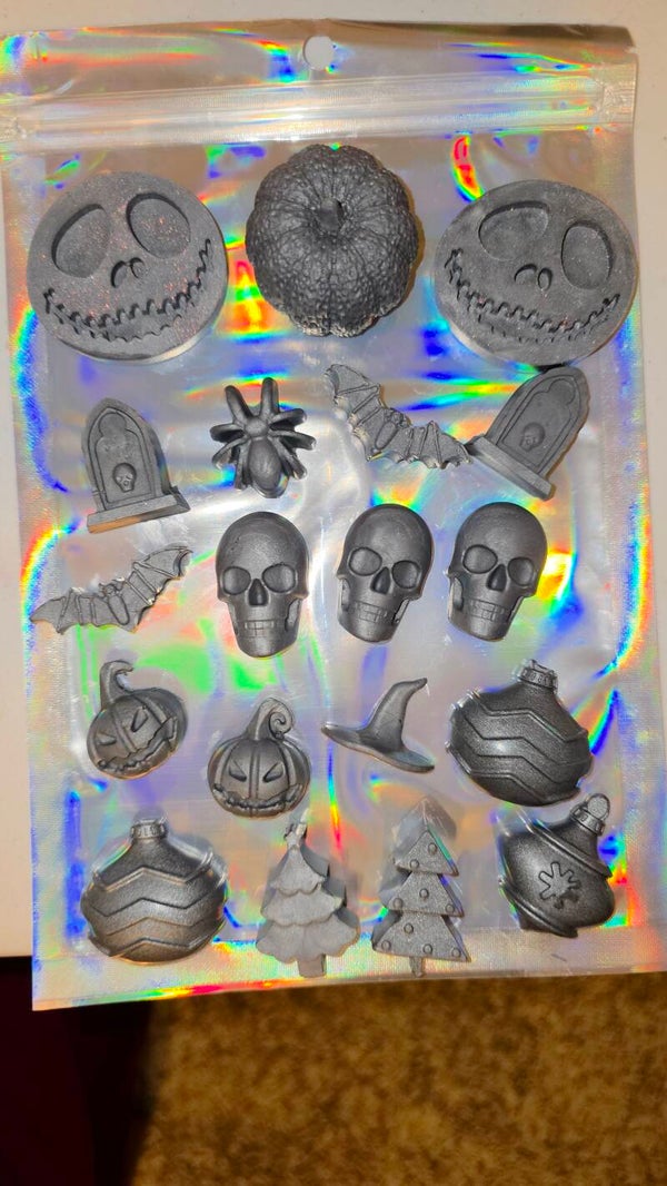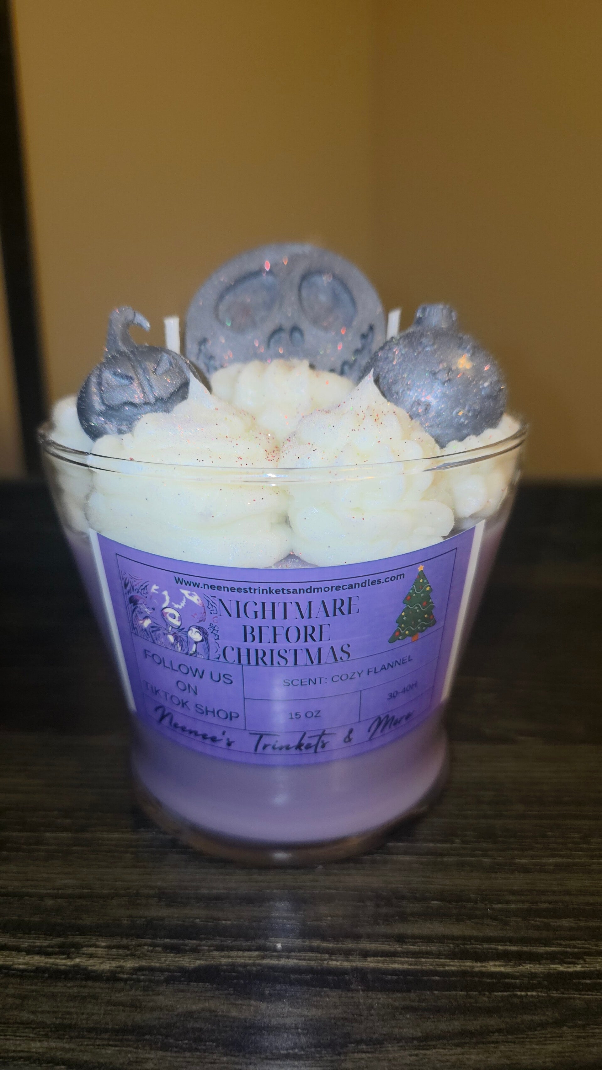 This 15oz hand-poured soy candle is topped with 3 glittery wax melts (pumpkins, trees, ornaments & Jack’s skull) you can melt separately or enjoy right on top.